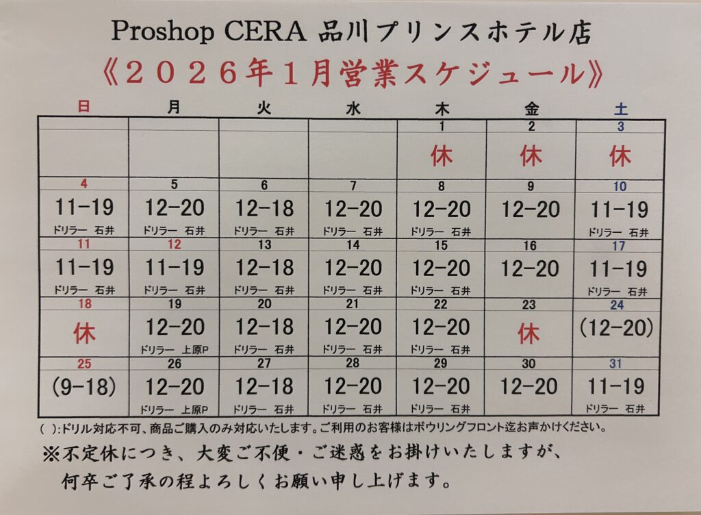 1月の営業スケジュールを更新しました
