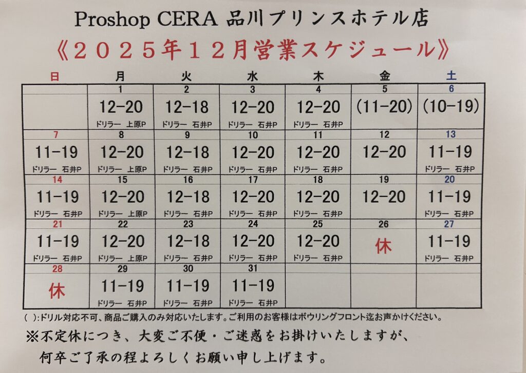 12月の営業スケジュールを更新しました